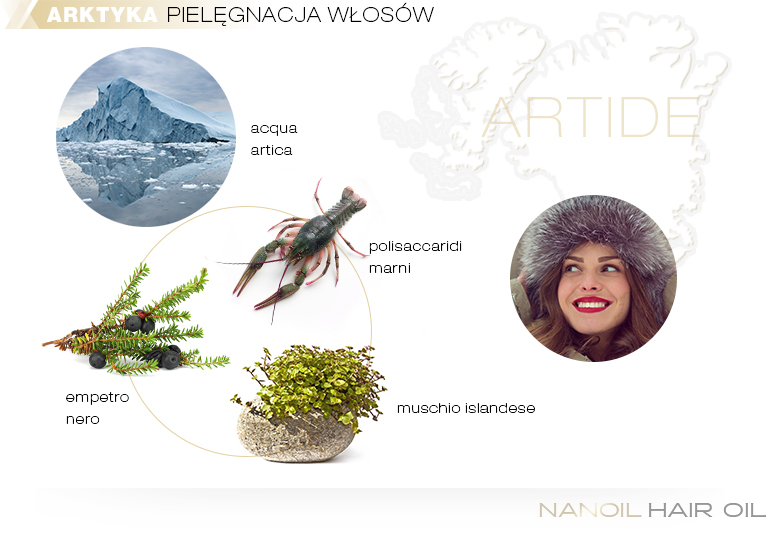 acqua artica (acqua glaciale) - è una delle acque sorgive più pulite del mondo. L'acqua nella cura dei capelli svolge un ruolo fondamentale, ed è spesso uno degli ingredienti principali contenuti in shampoo, creme per il cuoio capelluto o idrolati per capelli. L'acqua artica è ottenuta da fonti naturali che scorrono liberamente dalle regioni dei ghiacciai, quindi è priva di nitriti. È stata filtrata naturalmente per millenni, e le sue proprietà cosmetiche sono inestimabili. Incontaminata, ricca di minerali, completamente sicura e adatta alla pelle, l'acqua artica viene spesso aggiunta a shampoo e balsami. Inoltre, può essere usata per risciacquare i capelli (unendo infusioni di erbe selezionate) e come base per le argille minerali per capelli. Bisogna anche ricordare che l'acqua artica possiede la stessa struttura dell'acqua nel nostro corpo, e grazie alla biocompatibilità è possibile ottenere un'idratazione profonda e la penetrazione di altre sostanze attive nei capelli e nella pelle.
