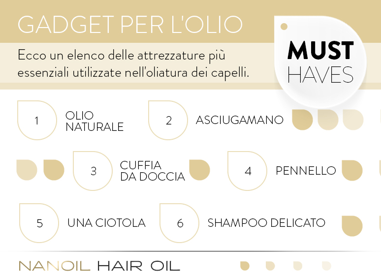 Ma non è tutto. Per oliare correttamente e con precisione i tuoi capelli, bisogna preparare alcuni oggetti che renderanno la tua vita (e il trattamento) molto più facile. Inoltre, dovresti sapere che l'oliatura dei capelli è una sorta di rituale che dipende interamente da te. quanto tempo gli dedichi, e da quali metodi utilizzerai.