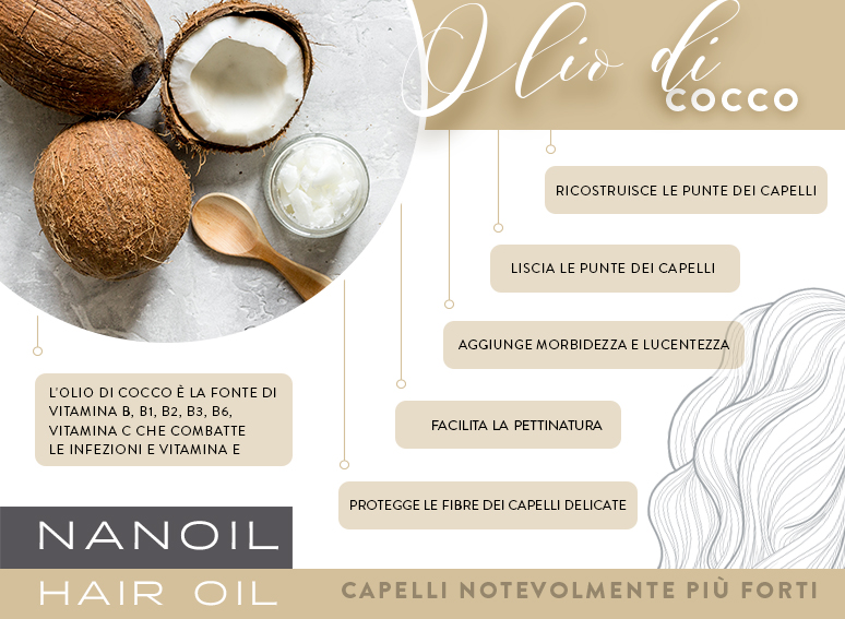 È utile anche nella cura del corpo. L'olio di cocco è fantastico come prodotto unico, o come ingrediente in altri cosmetici: viene utilizzato nella produzione di prodotti per pelle e capelli come base o additivo responsabile di protezione e idratazione. L'olio di cocco può essere utilizzato anche come crema per gli occhi o ingrediente per cosmetici fai da te. Si trova in Nanoil per capelli di bassa porosità e Nanoil per capelli di media porosità. Acquistare un olio per capelli pronto con una perfetta composizione di oli è un'ottima alternativa ai cosmetici fai da te che richiedono molto tempo per essere realizzati.