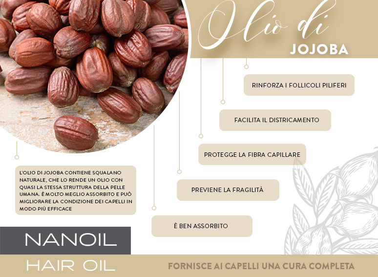 L'olio di Jojoba naturale è altamente biocompatibile con la pelle, quindi viene assorbito perfettamente, ed è ampiamente utilizzato in prodotti per viso, corpo e capelli. Funziona sia come cosmetico indipendente, che come ingrediente di prodotti fai da te. È spesso presente in creme per il viso, per il corpo, saponi e balsami. Nanoil per capelli di media porosità è ricco di olio di Jojoba naturale della migliore qualità, e funziona come regolatore e purificatore del cuoio capelluto. L'olio di Jojoba è utilizzato anche come base per i profumi, per rendere l'aroma più duraturo.