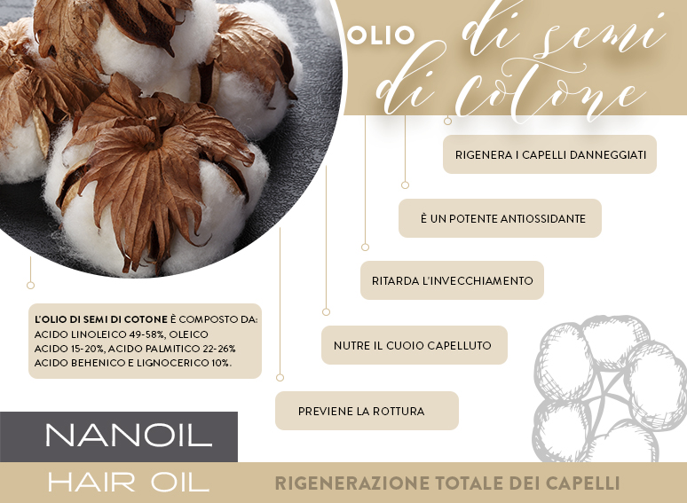 L'olio di semi di cotone funziona molto bene come siero per le punte: protegge le punte danneggiate e disidratate dei capelli, e le idrata. Grazie agli acidi grassi, i capelli non avranno più doppie punte, e le lunghezze non saranno più danneggiate. Inoltre, l'olio di cotone evita che le tossine penetrino nei capelli, ma consente ai nutrienti e alle vitamine di passare. Per fornire il migliore equilibrio di ingredienti condizionanti, bisognerebbe utilizzare una miscela di oli che si prendono cura dei capelli ad elevata porosità. Gli oli che forniscono un complesso di vitamine e minerali, rinforzano i bulbi piliferi, migliorano l'acconciatura e aggiungono morbidezza ed elasticità. L'ideale sinergia di questi oli si può trovare in Nanoil per capelli ad elevata porosità. Oltre ai sei oli naturali di alta qualità, contiene cheratina, lanolina e seta - tutto il necessario per rigenerare i capelli e fornirgli un aspetto ottimo e una fantastica lucentezza.
